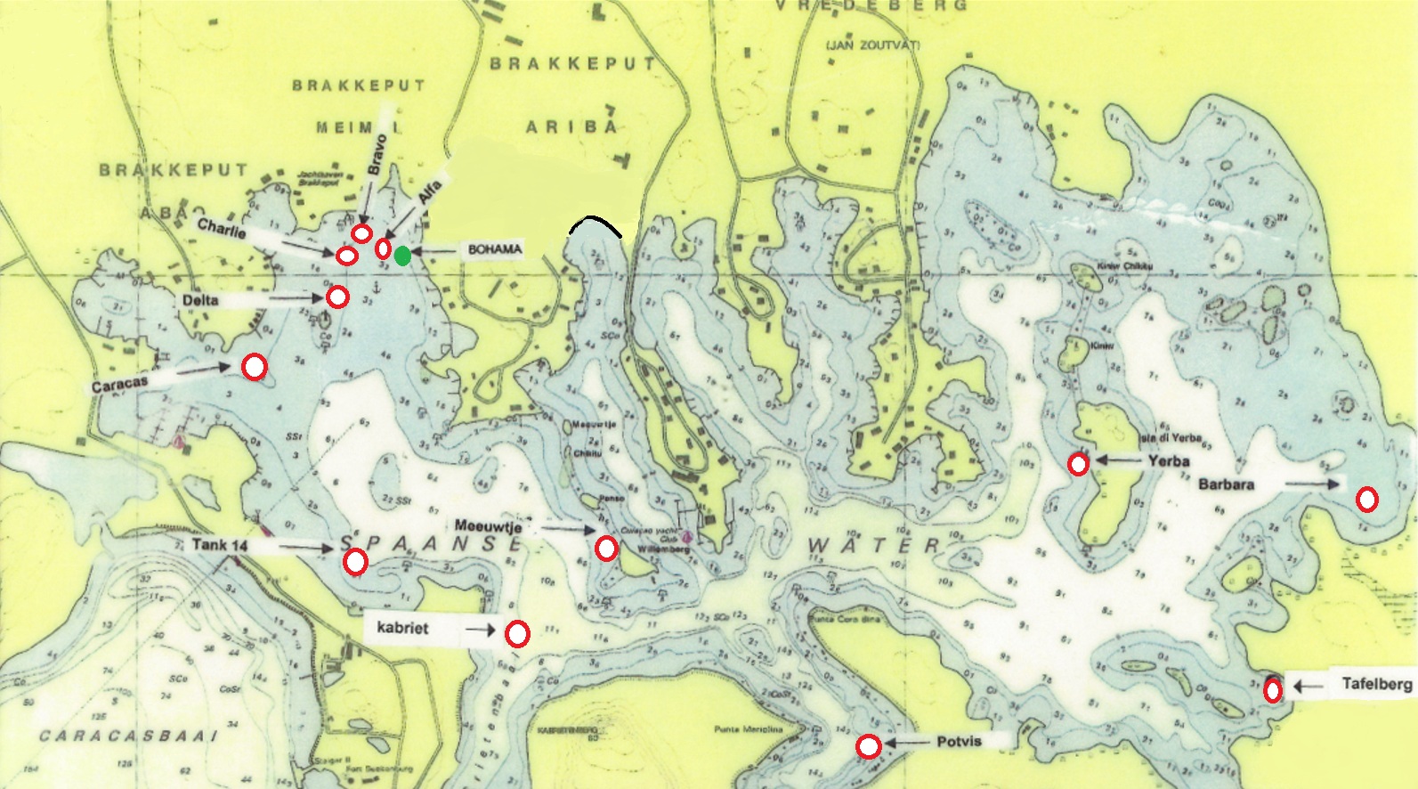 Het Spaanse Water is één van de bekendste en mooiste watersport gebieden van Curaçao! De naam komt waarschijnlijk uit de tijd dat de Spanjaarden Curaçao koloniseerden. Het gebied werd toen door hen gebruikt en kreeg zo deze naam. Het Spaanse Water is een grote natuurlijke lagune aan de oostkant van Willemstad en bestaat uit verschillende baaien, eilandjes, inhammen en een uitgang naar de Caribbische Zee. Vanuit verschillende stichtingen en verenigingen wordt met de Sunfish op het Spaanse Water gezeild. Recent zijn bijna alle rood/witte boeien vervangen én voorzien van hun naam. Let op: alle gele boeien duiden een ondiepte aan!
